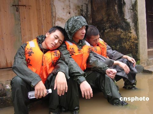 文昌邊防官兵十四日冒雨轉(zhuǎn)移文昌南陽辦事處桃村被洪水圍困的村民,圖為勞累的官兵在雨中背靠背小息。中新社發(fā) 蔣第二 攝