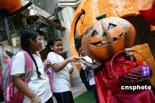 十月二十一日,兩名南亞小學(xué)生在香港時(shí)代廣場(chǎng)與南瓜人開(kāi)心嬉戲。當(dāng)日,香港時(shí)代廣場(chǎng)為迎接萬(wàn)圣節(jié)設(shè)置的“怪異南瓜陣”開(kāi)幕,吸引許多游客駐足玩樂(lè)。中新社發(fā) 洪少葵 攝