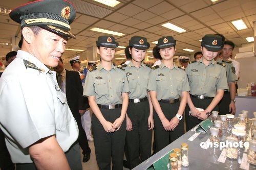 十月二十四日,中國人民解放軍駐港部隊八十位官兵訪問香港科技大學,這是駐港部隊首次到香港科技大學參觀訪問。圖為駐港部隊副司令員董文久(左一)與官兵們在科大實驗室參觀。中新社發 張勤 攝