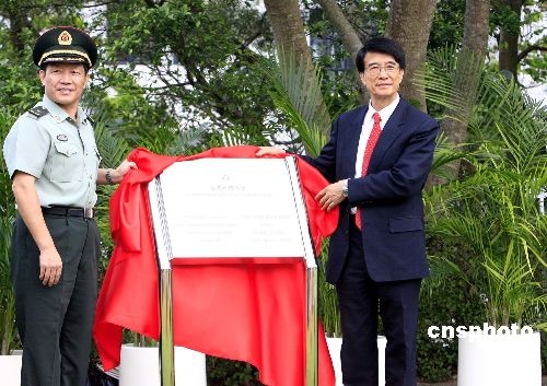 十月二十四日,中國人民解放軍駐港部隊八十位官兵訪問香港科技大學。圖為駐港部隊副司令董文久與香港科技大學校長朱經武在科技大學草坪主持植樹紀念及牌匾揭幕儀式。中新社發 張勤 攝