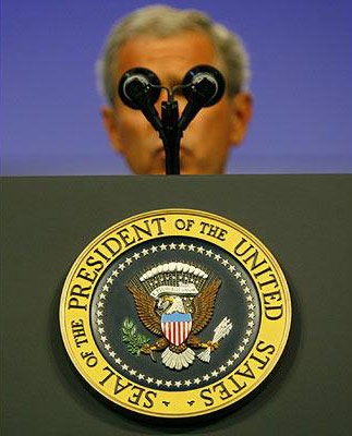 布什在美國海外退全軍人協會全國大會上發表講話時,麥克風恰好擋住了他的眼睛。作者:旺仔