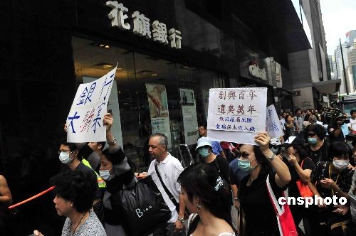 十月三十一日中午,香港約二百名購買雷曼產品的投資者,在中環八間銀行的總行及分行外游行,抗議銀行不負責任,誤導他們投資。中新社發 譚達明 攝