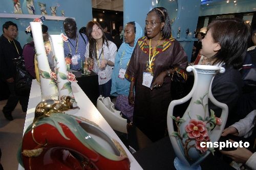 十一月二十七日上午,非洲客人在廈門文化藝術中心臺灣“法藍瓷”工藝品展館里流連忘返。中新社發 王東明 攝