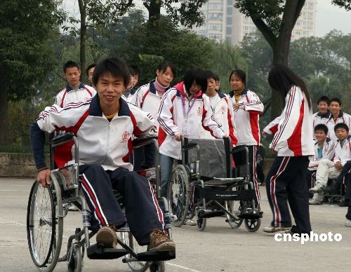 12月2日下午,百余名重慶中學生參加由英國駐重慶總領事館文化教育處主辦的校園體驗日迷你殘奧會。他們通過使用輪椅等殘障人士生活輔助工具進行比賽,此次活動旨在使學生們了解殘疾人、關愛殘疾人。中新社發 郭晉嘉 攝