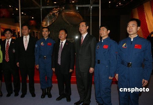圖為香港政務司司長唐英年、神舟七號載人航天飛行赴港代表團團長暨中國載人航天工程副總指揮張建啟、神七航天員翟志剛、劉伯明、景海鵬等在返回艙前合影。中新社發 武仲林 攝