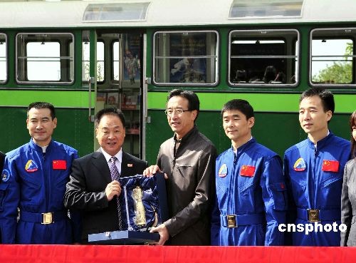 “神七”訪港代表團向香港旅發局主席田北俊(中)贈送紀念品。中新社發 譚達明 攝