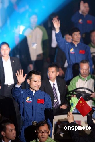 圖為翟志剛、劉伯明、景海鵬三位航天員進(jìn)入會(huì)場(chǎng)受到熱烈歡迎。中新社發(fā) 武仲林 攝