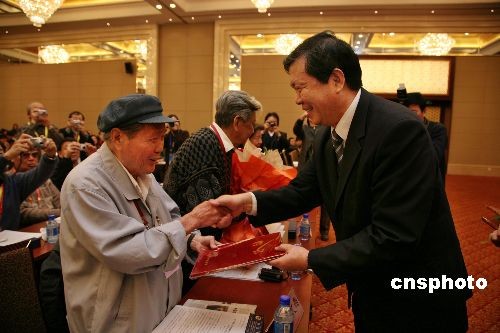 中國文聯黨組副書記、副主席李牧給新當選的中國美協顧問劉文西頒發聘書。