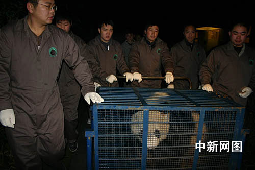12月23日7時20分,工作人員正在將贈臺大熊貓“團團”從熊貓別墅推至運輸籠,準備裝籠。
