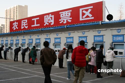 2009年1月5日,北京西站北廣場西側,首批70個農民工購票區臨時售票窗口對外開放。中新社發 任丘 攝
