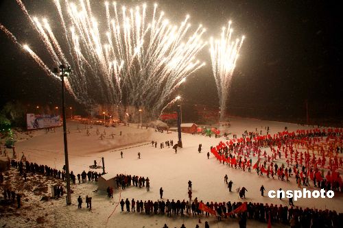 1月11日晚,銀裝素裹、晶瑩秀麗的沈陽棋盤山冰雪大世界歡聲雷動,“2009中國沈陽國際冰雪節、盛京燈會、關東廟會”拉開帷幕,這一冬日盛會為期35天。中新社發 黃金昆 攝