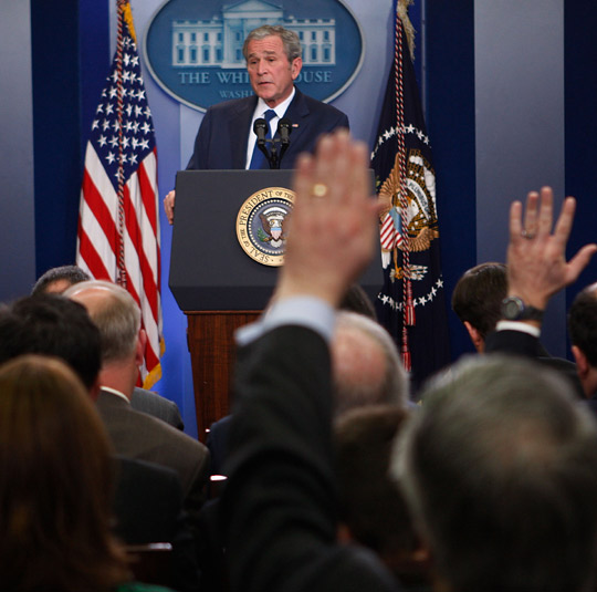 習(xí)慣為別人取外號的布什在一開始就稱今天的記者會為“最終臨別采訪”,并對八年來一直在白宮報道他的白宮常駐記者們表達(dá)了充分的感謝。