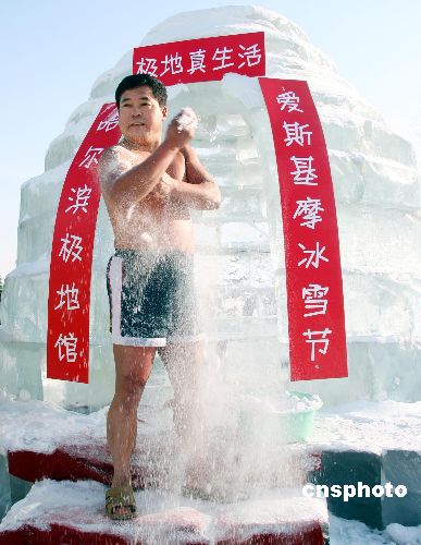 1月12日,“功夫海象”趣味擂臺賽在哈爾濱極地館再敲戰(zhàn)鼓,打破吉尼斯世界耐寒紀(jì)錄的“冰人”金松浩也參加其中。他與“功夫海象”耶娃在冰冷刺骨的海水中耐寒比拼長達(dá)一個多小時。最叫絕的是金松浩躺在零下30多度的冰床上與“功夫海象”一起比試仰臥起坐,這樣的場面令人驚嘆不已。來自哈市的6個家庭及松花江冬泳隊的6名成員也與“功夫海象”耶娃展開激烈角逐。他們在哈爾濱極地館的“愛斯基摩村”里爬冰堡、拉爬犁;三九天在戶外大口大口吃冰棍、啃凍梨、嚼冰糖葫蘆。真是笑傲冰雪,妙趣橫生。中新社發(fā) 姚庭山 攝