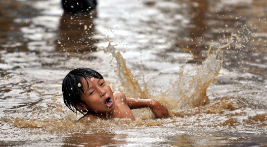 1月14日,在印度尼西亞首都雅加達市中心,一名男孩在暴雨過后被水淹沒的街道上游泳。