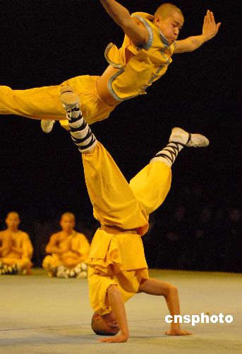 圖為少林武僧表演功夫—少林武集,武僧們精湛的武藝博得全場觀眾陣陣掌聲。中新社發 楊洋 攝