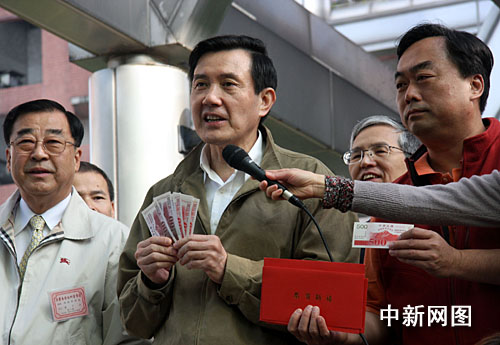1月18日上午,備受全臺和外界關注的消費券開始在臺灣各發放所發放。圖為馬英九今天上午九時許來到臺北市第1291號消費券發放所領取消費券。馬英九隨后發表講話,呼吁臺灣全體民眾善用消費券,積極促進內需,擴大消費。陳立宇 攝