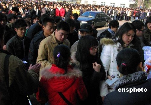 2月5日,“第三十四屆京城(北京)職場--2009年首場人才招聘會”,在全國農業展覽館新館開幕。 招聘會設立了約400個展位,應聘的北京高校學生多達約幾萬人次,場面異;鸨。