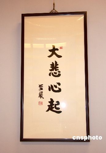 臺灣法鼓山創辦人圣嚴法師三日圓寂,四日移靈金山法鼓山世界佛教教育園區大殿供信眾瞻仰,圖為法鼓山現正展出的圣嚴法師墨寶“大悲心起”。中新社發 陳立宇 攝