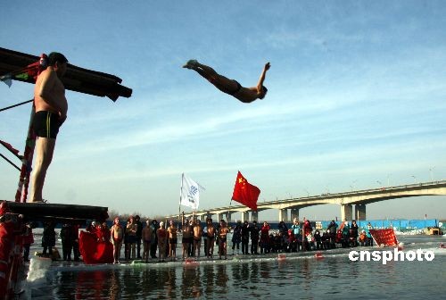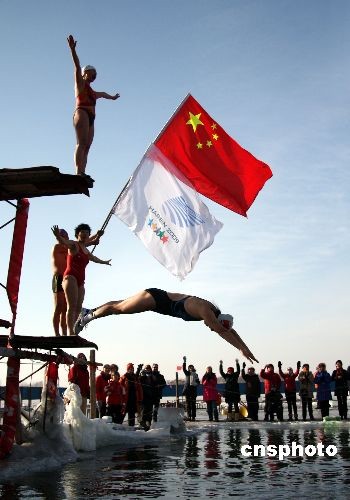 2月8日,在哈爾濱松花江公路大橋西側的黑龍江省冬泳協會浴場內,國內外游客正在觀看冬泳健兒的冬泳表演。當日正值哈爾濱第24屆國際大學生冬季運動會倒計時10天。