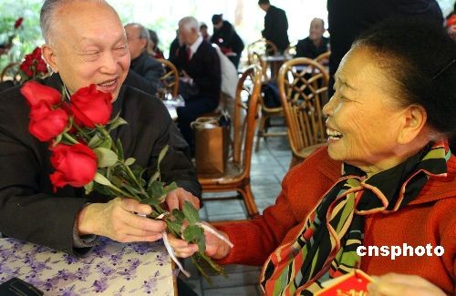 2月9日,中國傳統元宵佳節到來之際,北京植物園上演的“浪漫玫瑰文化周”吸引99對金婚夫婦共度元宵佳節,特邀而來的金婚夫婦(結婚滿50年)手捧著政府當年頒發的不同版本的結婚證,相互獻上象征愛情的紅玫瑰、相思紅豆,交換金婚禮物,重溫愛的誓言,在鮮花前回憶浪漫的美好時光,許多長者回憶起風風雨雨幾十年的時光,激動得熱淚盈眶。中新社發 錢興強 攝