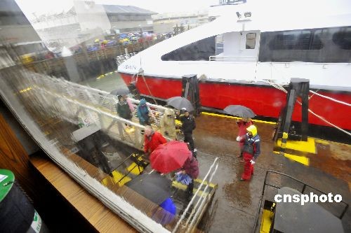 圖為民眾冒雨從舊金山登船前往天使島。中新社發 陳鋼 攝