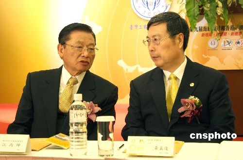 圖為臺(tái)灣海基會(huì)董事長(zhǎng)江丙坤(左)與中華全國(guó)工商業(yè)聯(lián)合會(huì)主席黃孟復(fù)交談。中新社發(fā) 陳立宇 攝