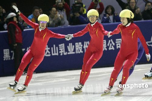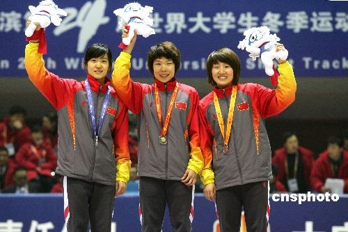 2月19日,世界大冬會(huì)短道速滑女子1500米決賽結(jié)束,中國隊(duì)包攬前三名,周洋以2分31秒658奪得金牌,這也是中國代表團(tuán)在本次大冬會(huì)奪得的首枚金牌,劉秋宏和孫琳琳分列2、3位。中新社發(fā) 富田 攝