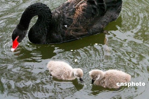 2009年2月21日,古城蘇州春風(fēng)送暖,陽光明媚,蘇州動物園里兩只剛出生半個多月的黑天鵝寶寶由其鵝爸、鵝媽的引領(lǐng)下,舉家進(jìn)入池塘戲水覓食,為游客增添了許多游園情趣。中新社發(fā) 王建中 攝