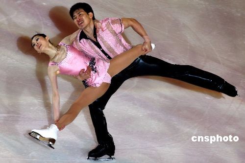 中國著名花滑組合、本屆大冬會雙人滑冠軍張丹張昊在表演中。中新社發 富田 攝