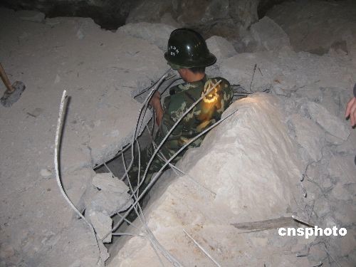 圖為都安縣消防官兵鉆入廢墟進行搜救。中新社發 蘭寶喜 攝