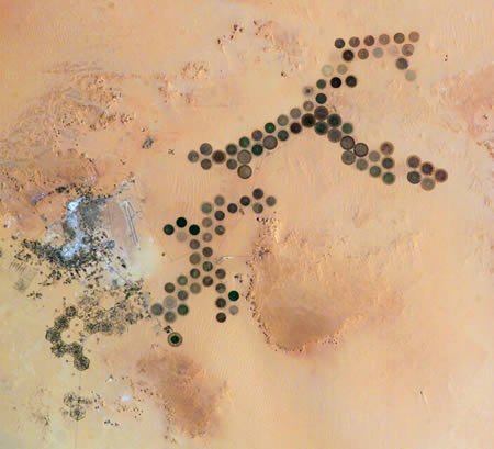 亞沙漠灌溉農業區:圖中沙漠中的綠色圓圈代表中央管道灌溉農業地帶。