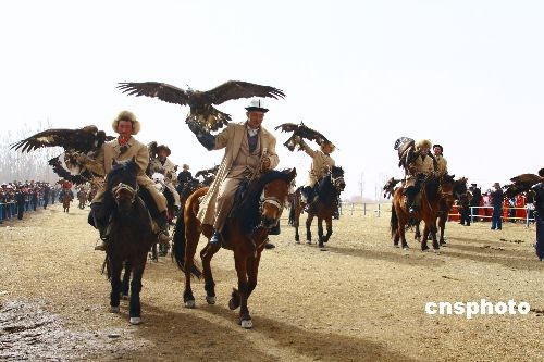 3月20日,新疆阿合奇縣舉辦第二屆獵鷹節(jié),當(dāng)?shù)乜聽柨俗巫迕癖娋奂谠摽h賽馬場,展示自家馴養(yǎng)的獵鷹。新疆阿合奇縣的柯爾克孜族人馴養(yǎng)獵鷹有著悠久的歷史,至今,當(dāng)?shù)啬撩袢酝暾A糁嫉鸟Z養(yǎng)方式,被譽為中國“獵鷹之鄉(xiāng)”。柯爾克孜族人在放牧的同時,經(jīng)常騎馬到高達近百米的高山頂上,將自己馴養(yǎng)的獵鷹放飛,因此當(dāng)?shù)乜聽柨俗巫逡脖蛔u為“鷹王”。 中新社發(fā) 馬衛(wèi)平 攝