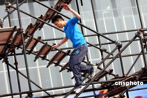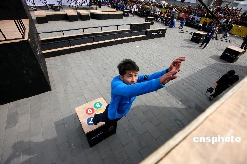3月26日,世紀天樂杯——中國首屆跑酷運動國際公開賽在北京盛裝亮相。跑酷運動誕生于上世紀80年代的法國,意為把整個城市當作一個大訓練場,一切圍墻、屋頂都成為可以攀爬、穿越的對象,最初曾是法國部隊訓練士兵的方法,目前是都市青年中流行的時尚運動。本次賽事為期四天,共有來自六個城市的跑酷隊參賽,比賽分團體和個人計時賽。在當天進行的團體比賽中,來自北京的“城市猴子”隊摘得桂冠。 中新社發 富田 攝
