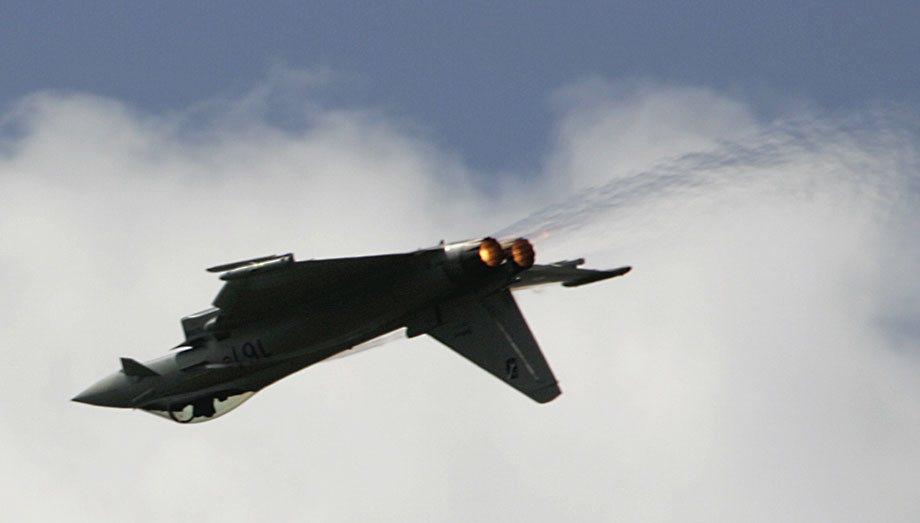 圖為歐洲臺風戰(zhàn)斗機進行飛行表演。