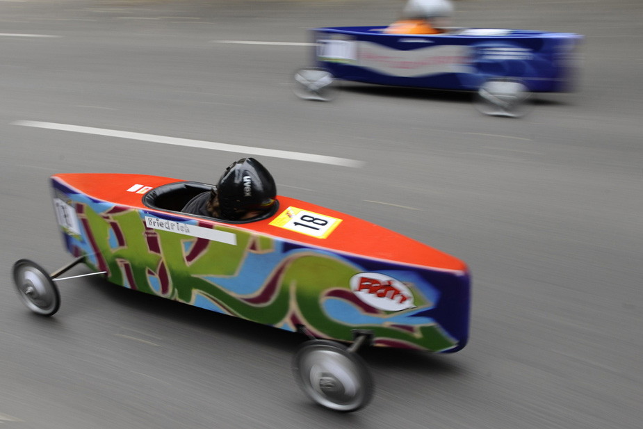 6月28日,德國柏林的德比郡舉行了第50屆“肥皂盒”競速賽車,該賽車沒有動力裝置,參賽者親手打造的“賽車”更使比賽妙趣橫生。