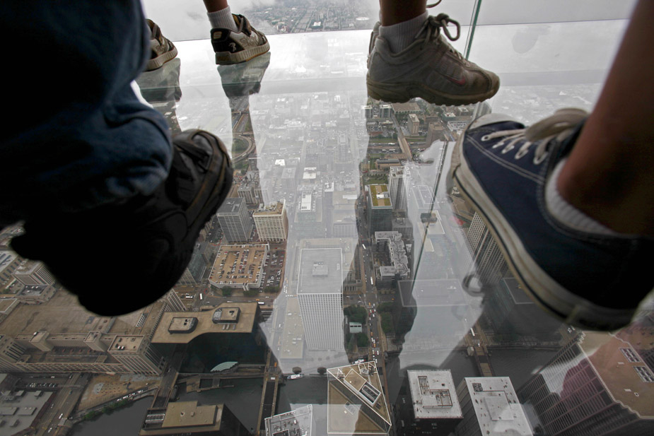 7月1日,美國(guó)芝加哥,西爾斯大廈在第103層瞭望臺(tái)增設(shè)的玻璃陽(yáng)臺(tái)對(duì)媒體開(kāi)放。這些玻璃陽(yáng)臺(tái)建在大廈西側(cè),從瞭望臺(tái)向外延伸約1.2米。陽(yáng)臺(tái)的玻璃地板厚達(dá)12.7厘米,可承重約5噸。