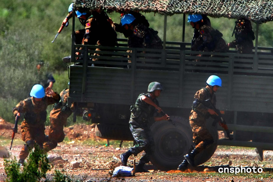 7月3日,中國和蒙古首次舉行維和聯(lián)合軍事訓練,以執(zhí)行聯(lián)合國框架下維和任務為背景,在北京地區(qū)某訓練場開展多種綜合演練。中新社發(fā) 宋吉河 攝