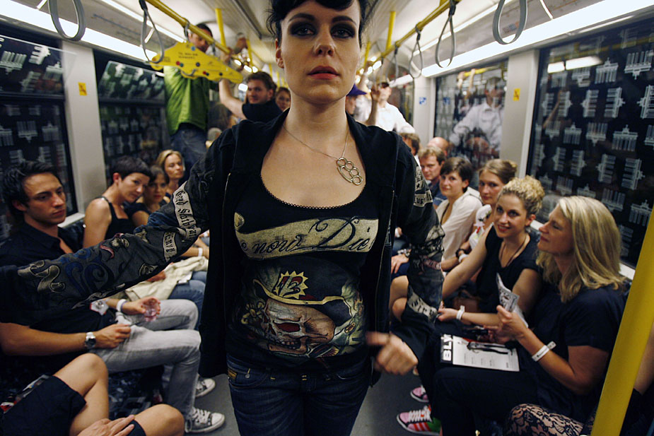 7月2日,模特在德國首都柏林的一輛地鐵上,演繹名為“地鐵上的貓步”時(shí)裝秀。