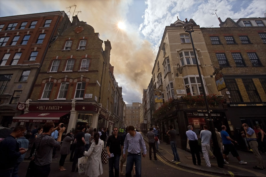 英國倫敦中部蘇豪區(qū)在當(dāng)?shù)貢r(shí)間10日下午2時(shí)左右發(fā)生火警,起火的5層高商業(yè)樓宇被嚴(yán)重焚毀,現(xiàn)場(chǎng)冒出大量濃煙。