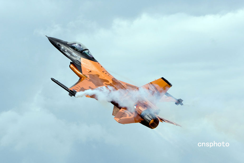 2009年7月,“2009英國費爾福德航展”在英格蘭費爾福德開展。圖為荷蘭皇家空軍F-16戰斗機,荷蘭皇家空軍此次以少見的橙色圖裝F-16戰斗機在航展上亮相。中新社發 潘禹 攝