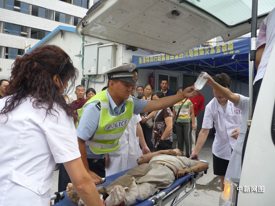 25日凌晨四點鐘左右,汶川縣境內國道二一三線徹底關大橋被山上飛下來的巨石砸斷,已造成100米的橋面坍塌,7輛汽車受損,12人不同程度受傷,3人死亡,都汶路通行中斷。圖為汶川縣人民醫院正在積極搶救傷員。 汶新 攝