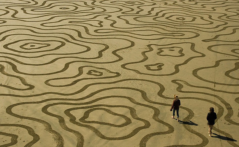 據(jù)英國媒體7月27日報道,藝術(shù)家Andres Amador用耙子在沙灘上作畫,眾多中心對稱的幾何圖形,不在乎是否能長久保留,但求被海浪帶走前與大自然的完美融合。
