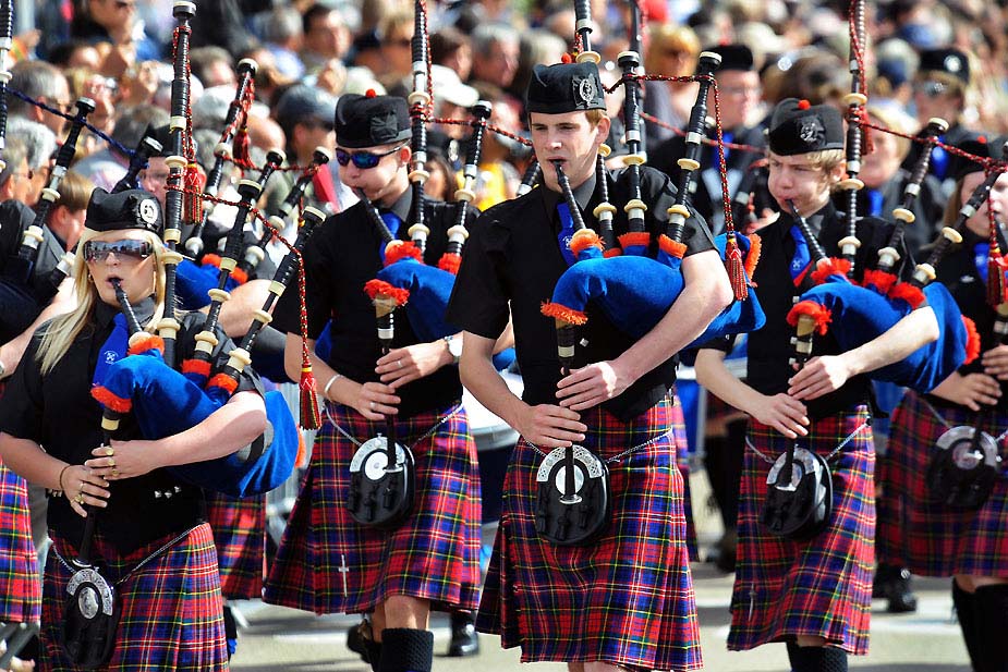 8月2日,蘇格蘭梅西爾風笛樂隊的藝術家們在洛里昂克爾特文化節上進行表演。