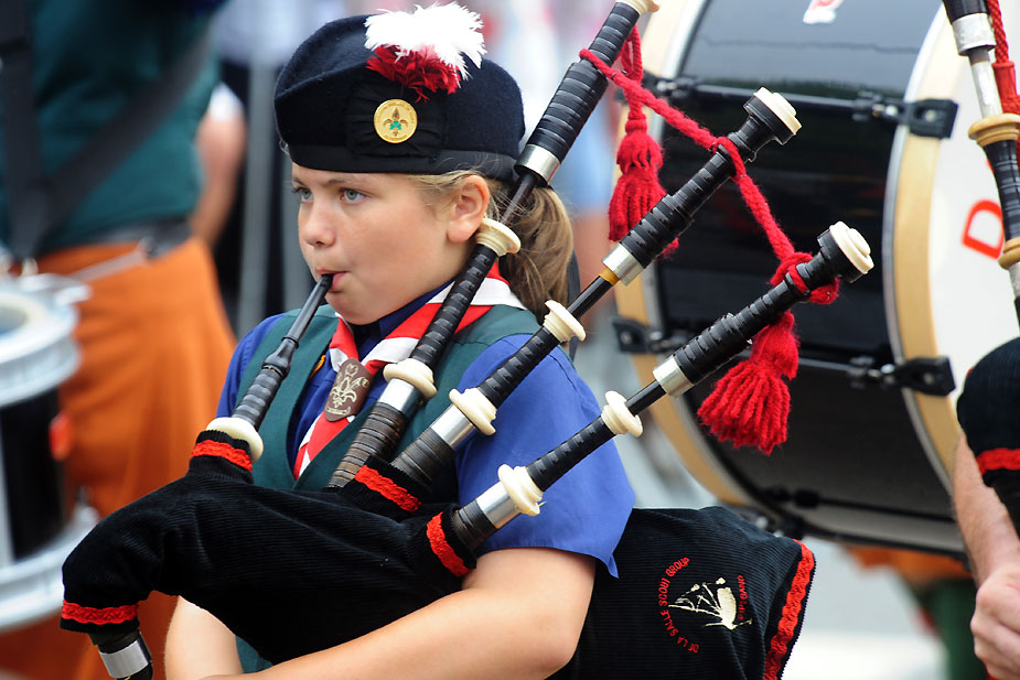 8月2日,拉薩爾童軍風笛樂團的一個小樂手在文化節上演奏風笛。