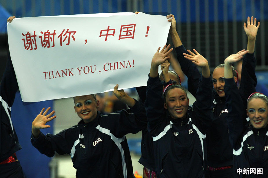 謝謝你中國(guó)——8月23日,美國(guó)花游隊(duì)隊(duì)員入場(chǎng)時(shí),打出“謝謝你,中國(guó)”的條幅。