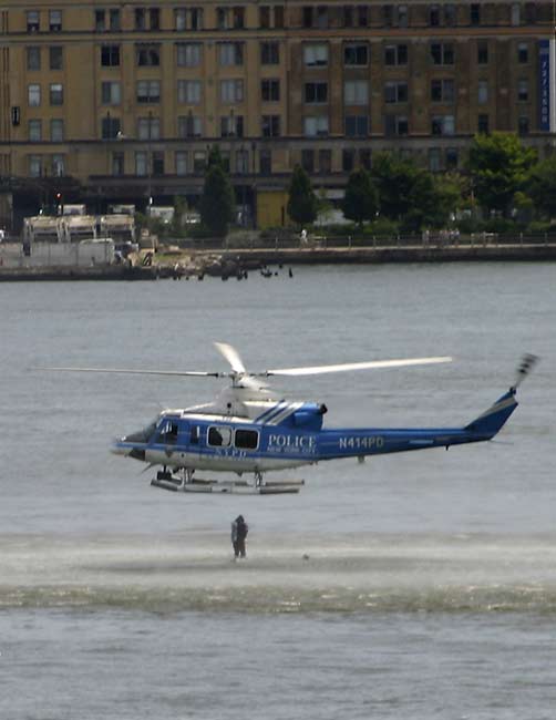 8月8日,紐約市曼哈頓西側的哈德遜河上空,一架觀光直升飛機和一架小型飛機相撞,兩飛機雙雙墜入河中。據稱觀光直升飛機上載有五名意大利游客和一名飛行員,而小型飛機上則有三人。圖為直升飛機在現場搜救。