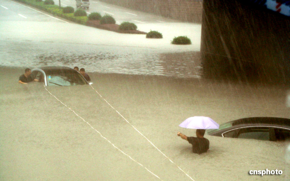 8月9日,在浙江溫州市區湯家橋路段,兩輛轎車被積水淹沒,救援人員正在進行施救。中新社發 吳水斌 攝
