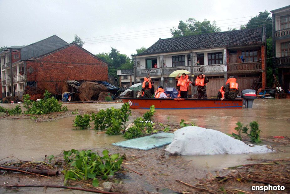 八月九日,武警官兵進(jìn)入福鼎南墘村搶救受災(zāi)民眾。受臺風(fēng)“莫拉克”強(qiáng)降雨的影響,福建寧德福鼎南墘村大面積受淹,大水同時也將通往該村的道路全部淹沒,致使該村猶如“孤島”,該村近三百名村民被困。中新社發(fā) 王東明 攝