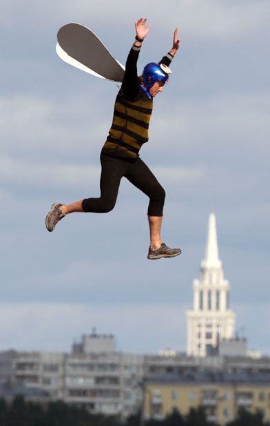 8月9日,莫斯科河畔舉辦一年一度的“墜落節(jié)”,表演者帶著自己設(shè)計(jì)制作的各種“飛行器”勇敢的從高空跳入水中。
