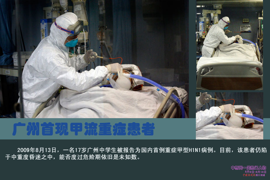 中新網(wǎng)本周熱點人物之廣州甲流患者——一名17歲廣州中學生報告為國內(nèi)首例重癥甲型H1N1病例,目前在廣醫(yī)一院廣州呼吸病研究所ICU救治重癥監(jiān)護。昨日記者在ICU外看到正接受重癥監(jiān)護的這名特殊病例,他陷于中重度昏迷,能否度過危險期依舊是未知數(shù)。